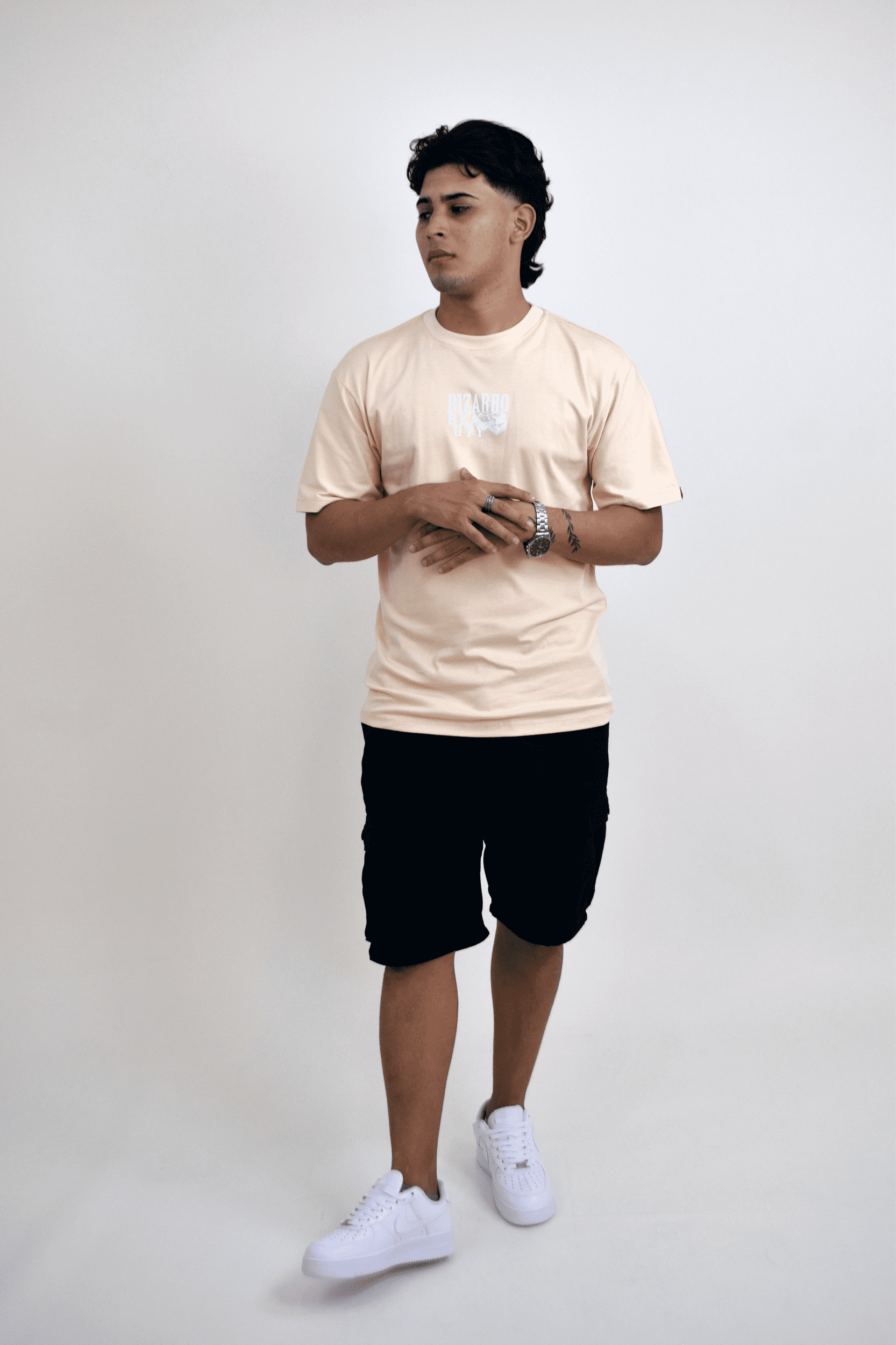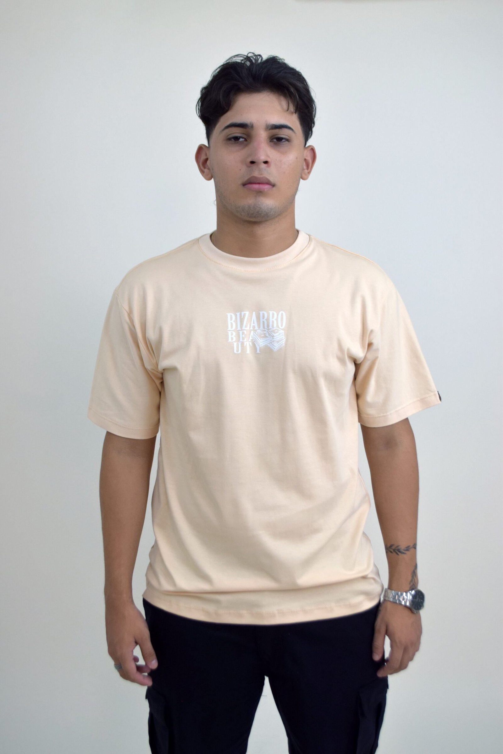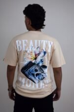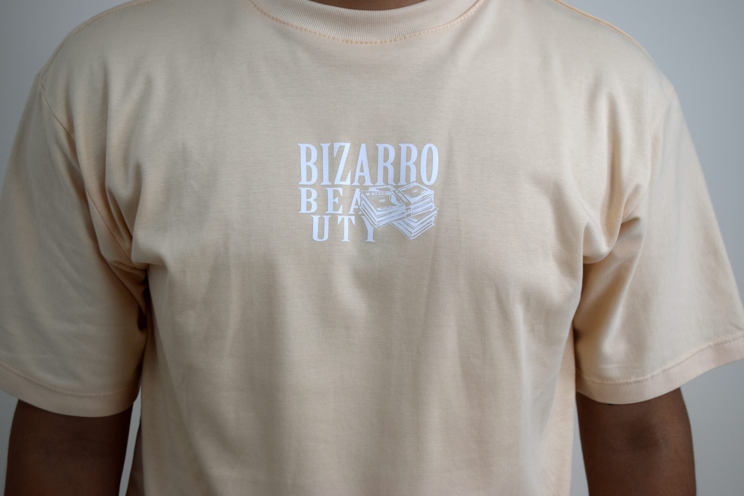 Camiseta semi oversized color crema con estampado frontal y gráfico posterior “BIZARRO BEAUTY MONEY”. Estilo urbano, cómodo y moderno.